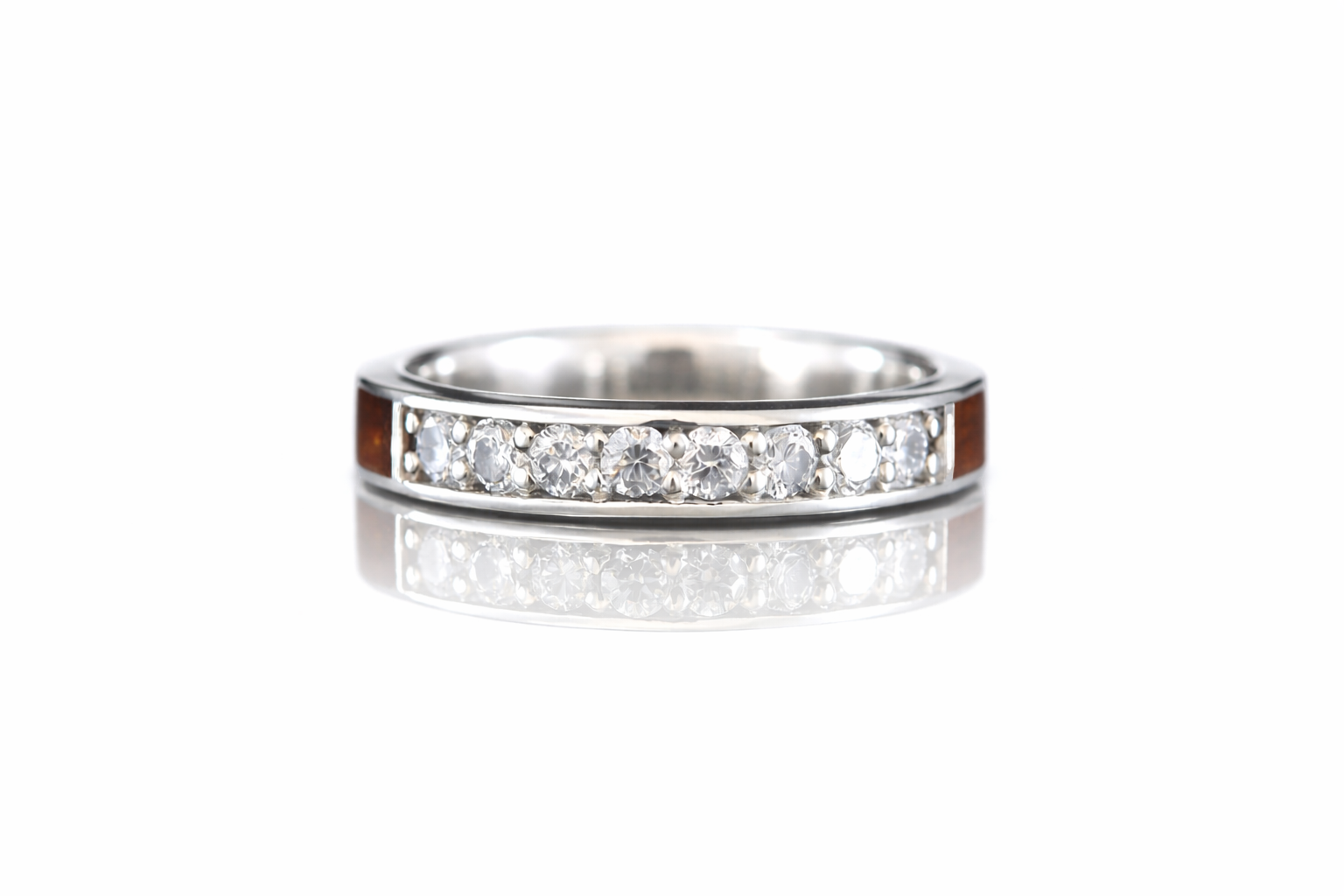 A diamond anniversary ring is a beautiful gift to give your significant other. It’s a symbol of your devotion and a sign that you love her just as much today as you did the day you took your vows. When choosing a ring for this special occasion, you want something that’s not going to be your run-of-the-mill diamond ring. You want your choice to reflect your sentimentality and commitment. Our white gold and wood diamond ring consist of a row of sparkling white diamonds. It’s also made of Hawaiian koa wood, a strong, durable hardwood. It’s the perfect combination for the woman who stole your heart and who you’ll never let go of for as long as you live.