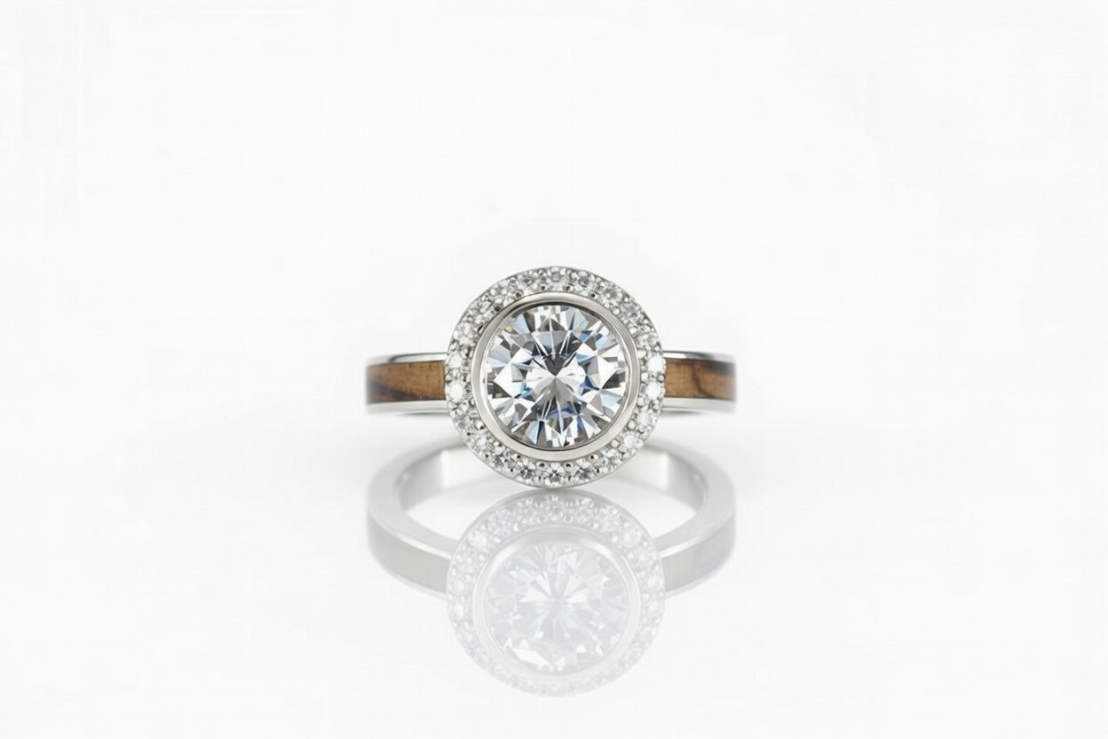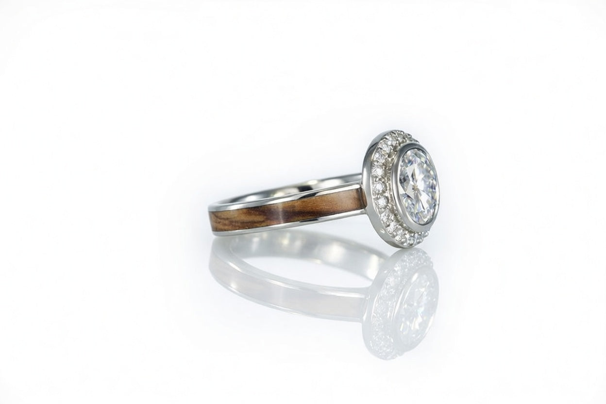 WHITE GOLD BETHLEHEM OLIVE WOOD DIAMOND HALO BEZEL ENGAGEMENT RING