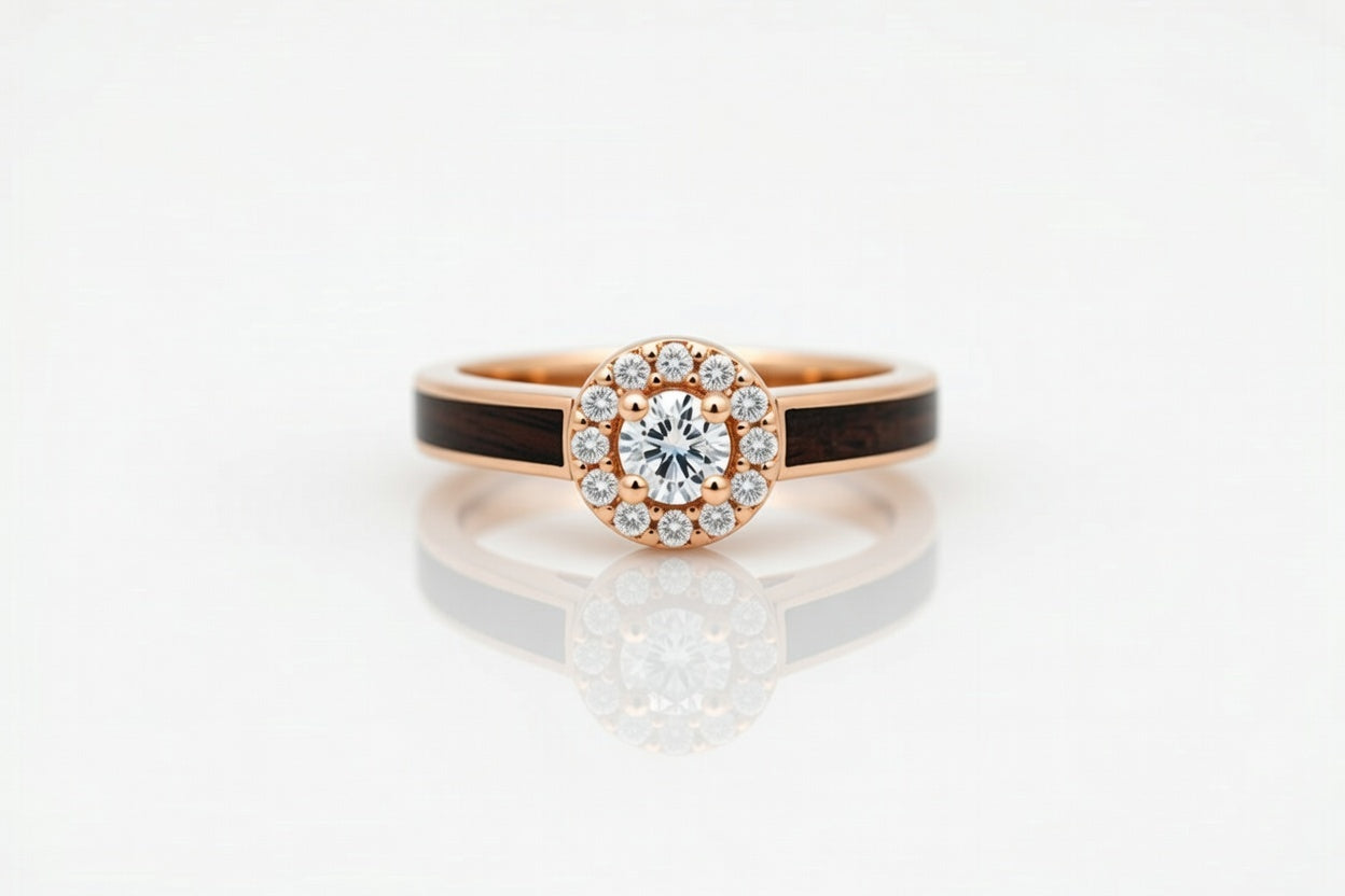 A thick band of dense ebony set into dark rose gold, a ring for a serious woman, deliberate and careful and final in her actions. She knows what she wants, and she finds a way to get it. But the tulip design slopes around her finger and directs the eye upwards to the halo of diamonds, stark and bright against the severe wood: She knows what she wants, and it’s you. It’s love. It’s to be loved, respected, cherished. Her certainty, her determination, both directed towards the good and the true.