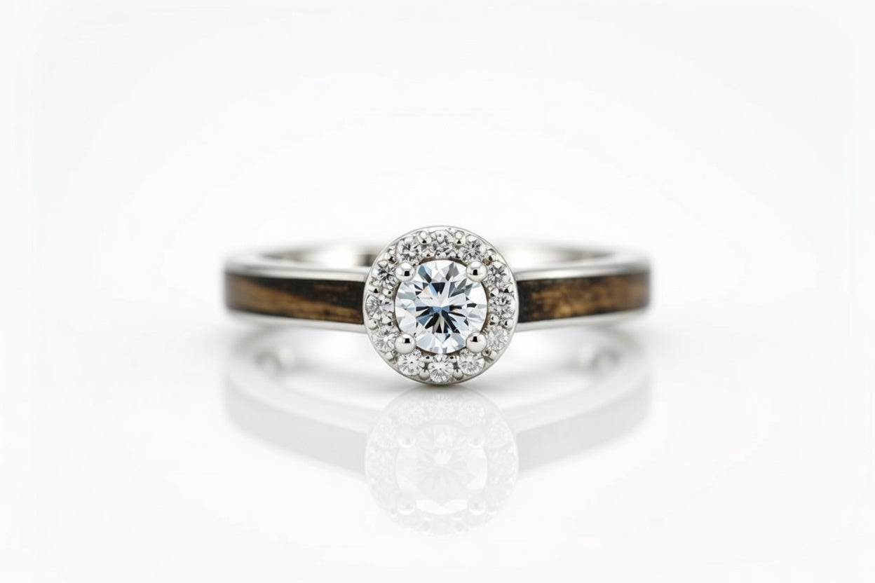 WHISKEY BARREL WOOD 14K WHITE GOLD DIAMONDS HALO RING