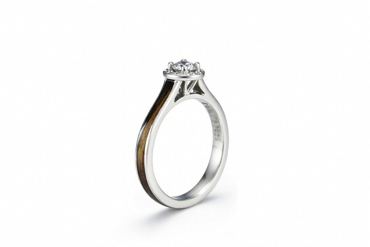 The dark streaks in the grain of this upcycled whiskey barrel wood once used by the Jack Daniel Distillery flow like currents in a river, falling from the crystal faucet that is the halo, gently bending around her finger through the aqueduct of white gold, and back into the diamond. It completes a circuit of grace, beauty, and motion, making the powerful diamond at the top glow with that energy. It’s the same energy she herself possesses, imbued into and represented by this ring.