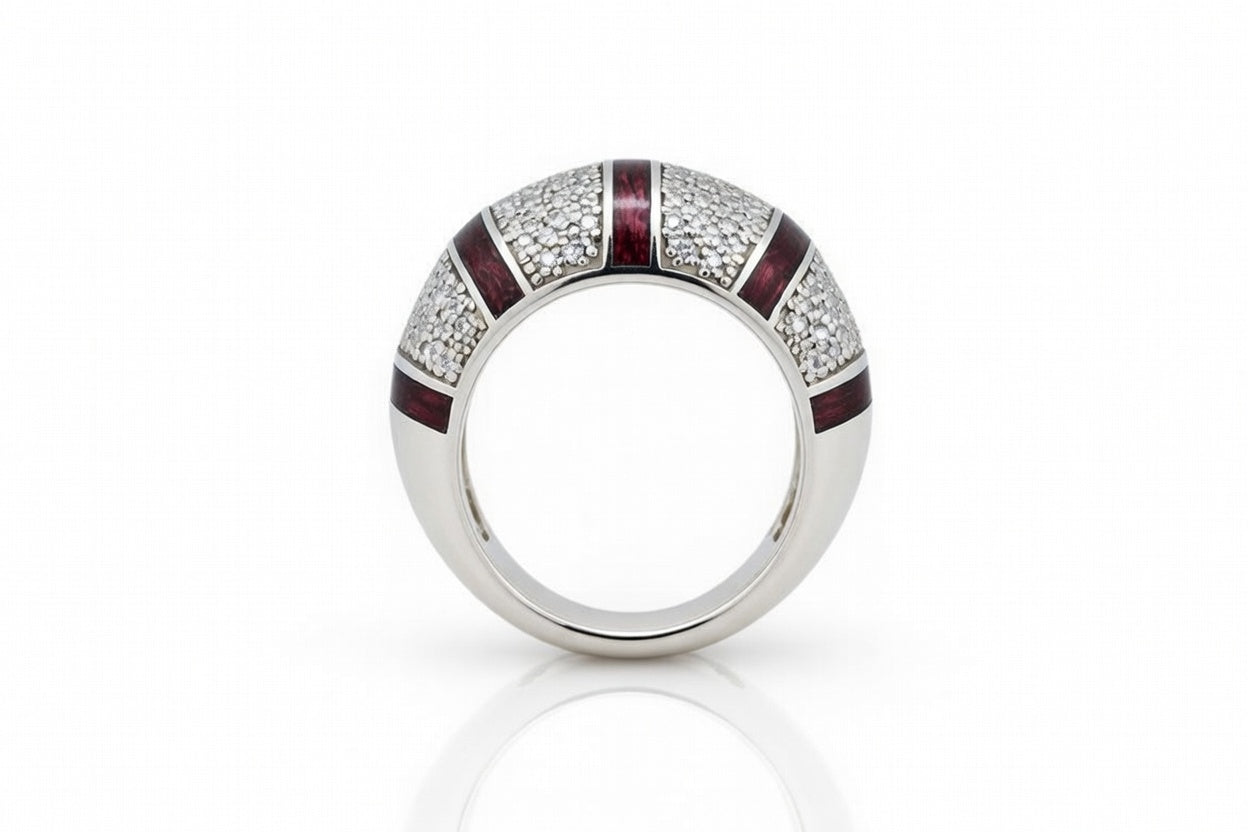 Purple has been the color of royalty for millennia. Originally distilled from trace amounts of dye found in oysters, clothes, and jewelry with that color was reserved for the Roman Senate, for kings and queens, for the drivers of the world. Here, we present our crown jewels: Purpleheart wood inlaid into a broad crown of white gold, studded with diamonds. This is a ring for true royalty, regal in its amaranthine streaks, and illustrious in its sheen.
