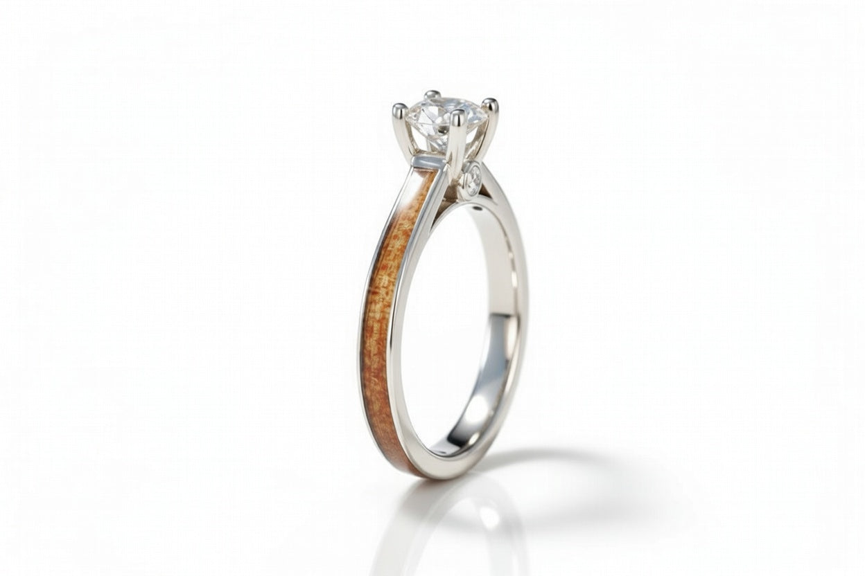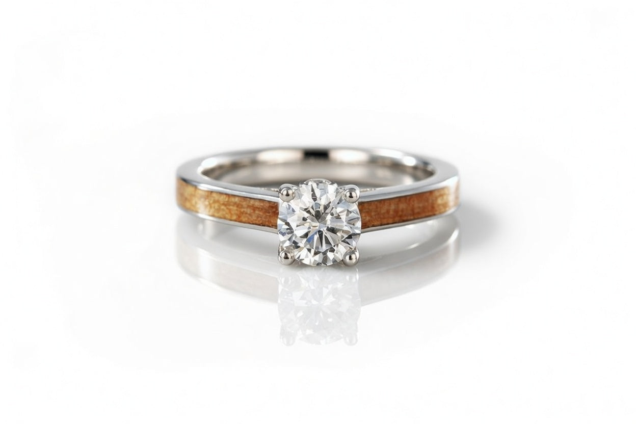 Embody the brightness of your love for her with this gorgeous wooden engagement ring derived from ancient Kauri wood. Natural beauty meets timeless elegance in this brilliant wood and diamond ring. Attentively set in 14K white gold, this wooden engagement ring is studded with Tiffany side stones, reflecting light and beauty from every angle. Ancient Kauri wood is recognized as the oldest wood available in the world, preserved for thousands of years underground in New Zealand. The glowing tones and natural grains perfectly represent the steadfast, awe-inspiring nature of the powerful woman who wears this extraordinary handcrafted ring. Your fiancé is remarkable, and you want to give her an engagement ring that embodies her unique qualities. This ancient Kauri wood and Tiffany ring is sure to match her timeless beauty and elegance. Kauri wood is said to be 50,000 years old, buried for millennia in New Zealand. Not only does this wood make an exceptionally distinctive engagement ring because of its age, but it does so because of its beauty as well. This wood has been described as more like a jewel than wood because of its brilliant iridescence and intricate grain. That, along with the Tiffany set diamond, will be the one-of-a-kind engagement ring you want your fiancé to have.