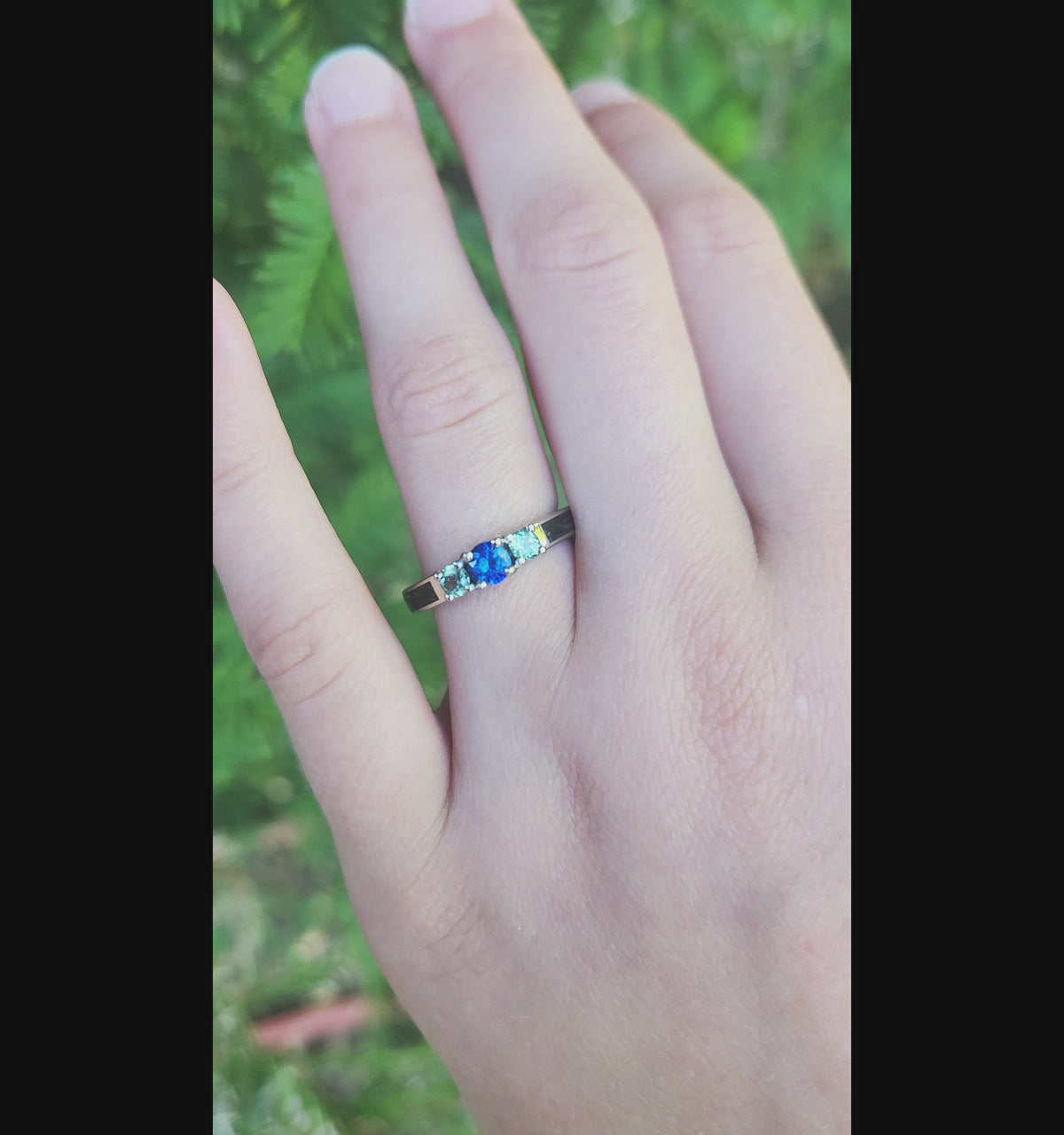 WALNUT WOOD 14K WHITE GOLD SAPPHIRE/TOPAZ 3 STONE CURVE RING